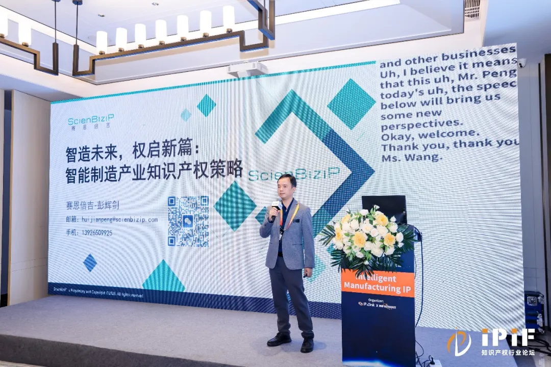 3月31日至4月2日,第五届知识产权行业论坛(Intellectual Property Industry Forum,简称iPiF)在杭州隆重举行。本届论坛以“专业化、国际化、标准化”为基调,设立主论坛及医药、TMT、半导体、新能源、智能制造五大分论坛,汇聚了800余位行业精英、企业代表及知识产权专业人士,围绕知识产权热点议题展开深度对话。赛恩倍吉全程参与本次论坛并设立展台,总经理郑小兵携多位资深专家出席,与参会嘉宾就智能制造、AI+制造、企业知识产权战略、专利转化运用等议题进行深入探讨,并与多家跨国企业及机构代表交流共享海内外最新政策动态。 在4月1日智能制造分论坛中,赛恩倍吉高级总监彭辉剑发表了题为“智造未来,权启新篇:智能制造产业知识产权策略”的主题演讲。